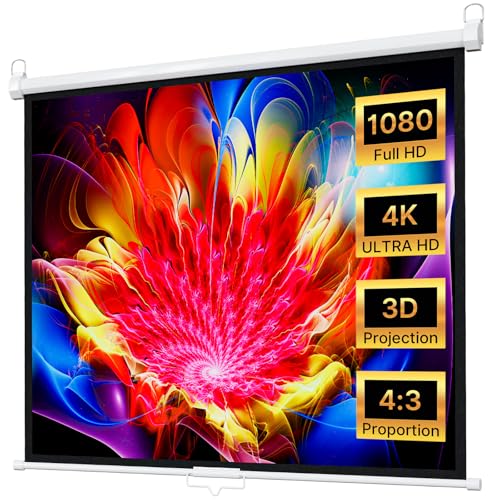VEVOR Manual Projector Screen, 72 inch 4:3 4K 1080 HD Retractable Pull Down Projector Screen, Wall Mounted Movie Projection with Pull Rope, Portable Display Projectoin for Family Home Office Theater