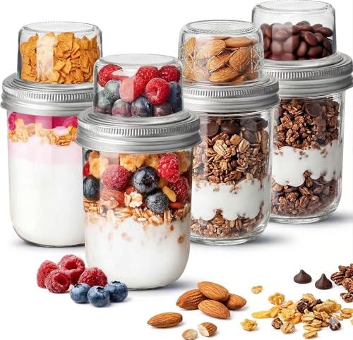 Large Capacity Overnight Oats Jars with Lids (4Pcs) Dual-Layer Chia Pudding Jars with Dry and Wet Separation Yogurt Parfait Container for Oatmeal Cereal Nut & Fruit Meal Prep Glass Jars for Salad