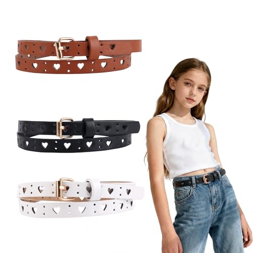 3pcs Girls Leather Belts for Kids Size 10-12, Openwork Heart Style Skinny Leather Toddler Teen Belt Clothing Accessories for Jeans Dresses Uniform (Black, White, Camel)