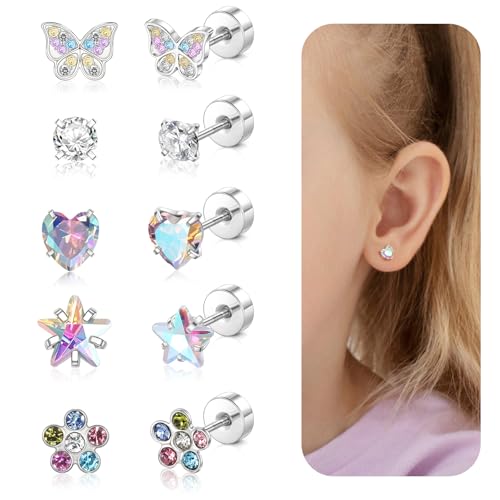 Gold Stud Earrings for Women, Small CZ Stud Earrings Flower Screw Back, Helix Conch Piercing Earrings, Flatback Cubic Zirconia Stud Earrings Hypoallergenic Cartilage Earrings for Girls (5mm Stud Silver)