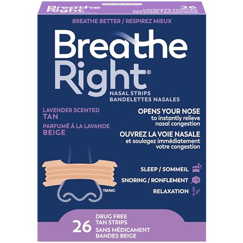 Breathe Right Nasal Strips, Lavender Scented, Tan, Drug-Free Snoring Solution & Nasal Congestion Relief Caused by Colds & Allergies, Nightly Sleep, 26 Count