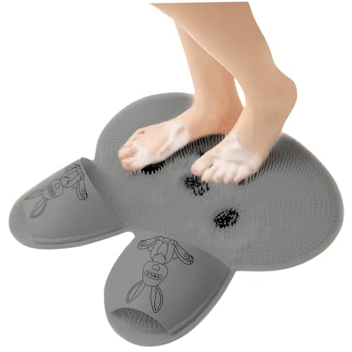 Extra Large Rabbit Design Shower Foot Scrubber Mat, Silicone Foot Scrubber with Non-Slip Suction Cups for Cleaning Massage (Grey)