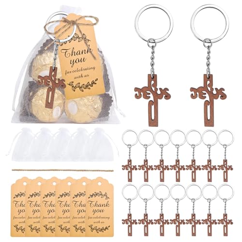 YYBD 25 Set First Communion Gift Wooden Cross Keychains with Thank You Tags & Mesh Bags Rosary Catholic Pendants Easter Basket Stuffer for Christian Baptism Christening Confirmation Baby Shower