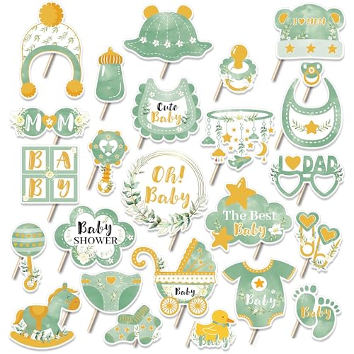 JOLINTAL Sage Green Cute Baby Shower Photo Booth Props - 33 Pcs Natural Gender Reveal Newborn Party Favors for Guest