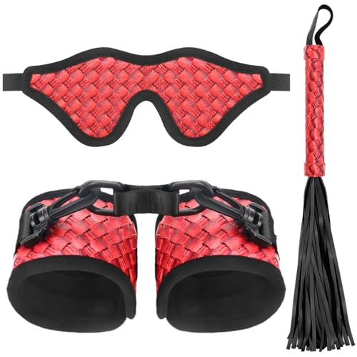 Satin Eye Mask Set of 2, Cozy Adjustable Plush Handcuffs, Fun Party Game Accessory Set of 2 (Red-3pcs)