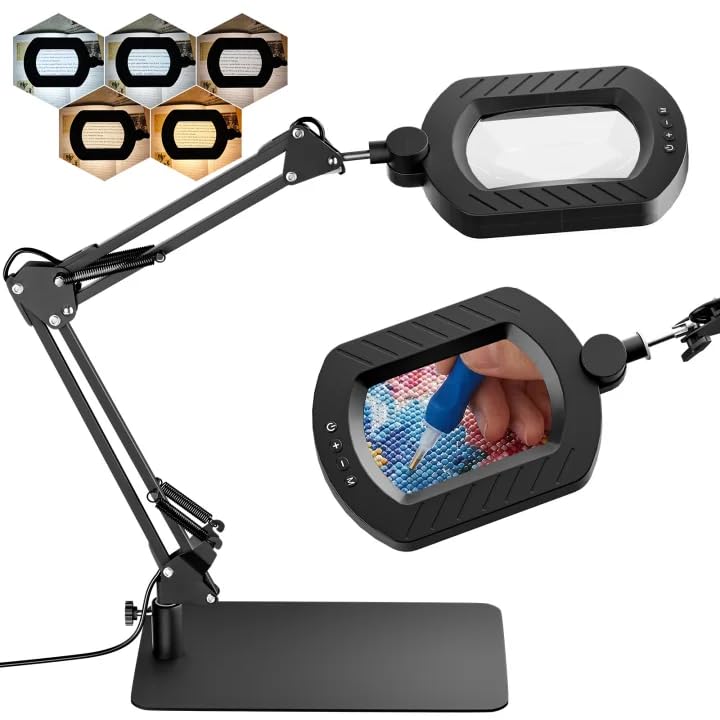 10X Magnifying Glass with Light and Stand, 5 Color Modes,10 Brightness Levels, 2-in-1 Magnifying Desk Lamp with Heavy Base Clamp Hands Free, LED Lighted Magnifier for Reading Crafts Close Work