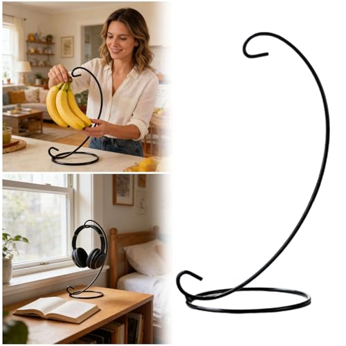 Winmien Banana Holder Stand, Stable Metal Freestanding Banana Hanger with Hook, Moon Shape Modern Fruit Storage Keeper for Kitchen Countertop (Metal Base,Black)