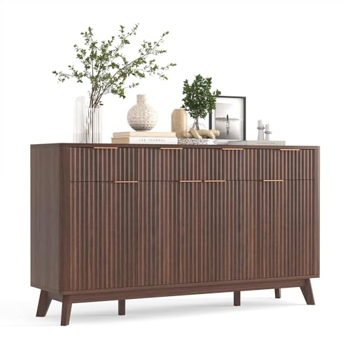 IDEALHOUSE Fluted Sideboard Buffet Cabinet with 3 Storage Drawers & Adjustable Shelves, Wooden Coffee Bar Cabinet Modern 60in Wide TV Stand for Living Room & Kitchen Dining Room - Walnut