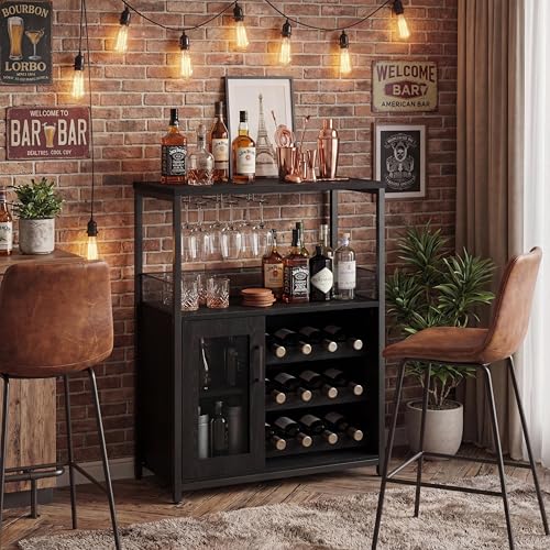 LITTLE TREE Black Bar Cabinet, 4-Tier Home Mini Bar with Stemware Rack, Freestanding Wooden Bar Table, Modern L-Shaped Liquor Table Cabinet for Living Room, Dining Room