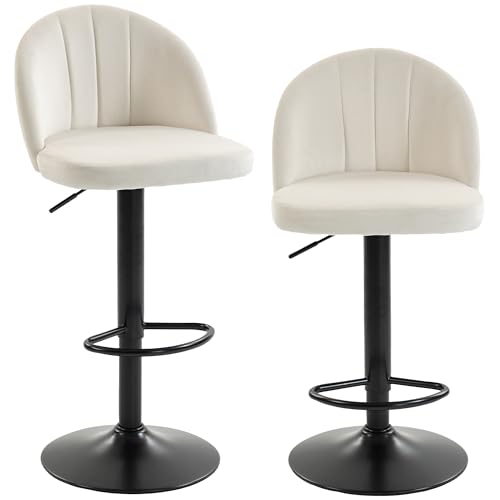 HOMCOM Bar Stools Set of 2, Swivel Counter Height Barstools with Adjustable Height and Cutout Back, Velvet Upholstered Bar Chairs with Round Metal Base and Footrest, Cream