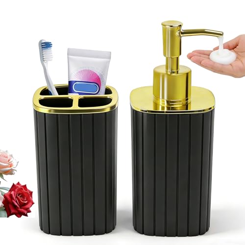 5 Piece Complete Bathroom Accessories Set, Includes Electric Toothbrush Holder, 16.9 oz Dispenser for Liquid Soap or Lotion, Soap Dish, 2 Tumblers, Made of Marble-Imitated Resin (Classic Black)