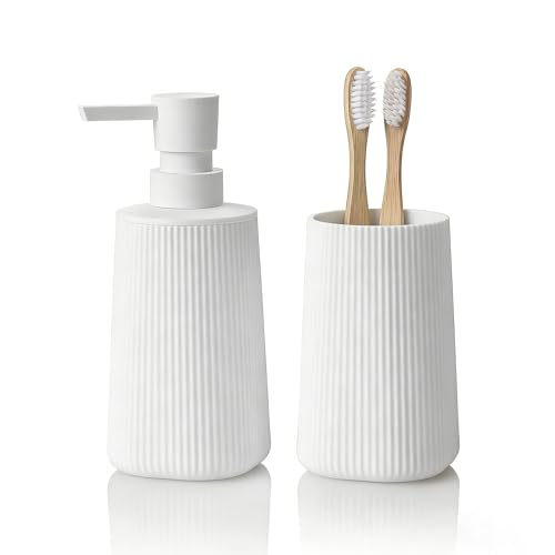 BLBYHO 5 Pieces White Ceramic Bathroom Vanity Countertop Accessory Set, Bathroom Soap Dispenser Set, Include Soap Dispenser, Toothbrush Holder, 2 Tumbler, Soap Dish (Color: White)鈥︹