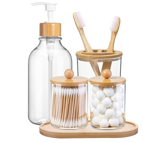 Navaris Bamboo Bathroom Accessories Set - 4-Piece Bath Set with Toothbrush Holder, Soap Dispenser, Storage Container, Organiser Tray - Natural Wood