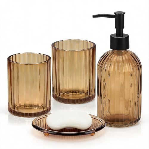 Topsky Glass Bathroom Accessories Set of 4,Clear Vertical Stripe Design with 400ml Liquid Hand Soap Dispenser,Toothbrush Holder,Mouthwash Cup,Soap Dish for Bathroom Countertop