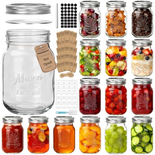 CycleMore 16oz Mason Jars, 15 Pack Embossed Glass Canning Jars with Lids and Bands, Overnight Oats Containers for Canning, Pickling, Food Storage, DIY Projects