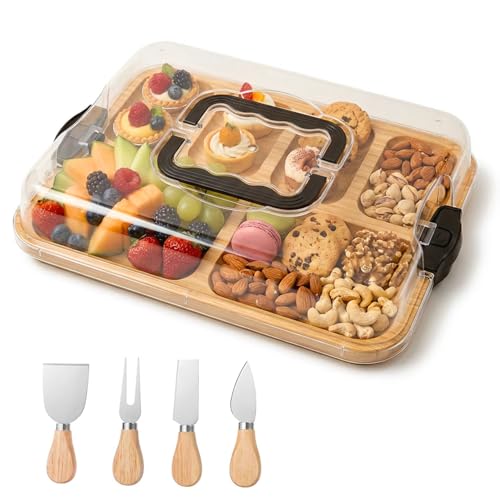 Charcuterie Board with Clear Lid, Portable Cheese Board with Dust-Proof Cover, Reversible Bamboo Cutting Board & Snack Tray, Easy-Open Latches for Picnics, Parties, Housewarming Gifts (6 Compartments)