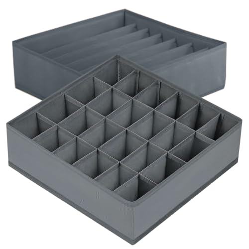 AARAINBOW 2 Packs Tie Storage Box with Lid, 60 Cells Sock Underwear Organizer for Dresser Drawer, Foldable Closet Necktie Holder for Men, Fabric Wardrobe Panty Container for Belt Scarf Lingerie, Gray