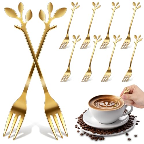 ROMISBABA 10pcs Gold Leaf Mini Stainless Steel Cocktail Forks for Appetizers Desserts and Salads, Small