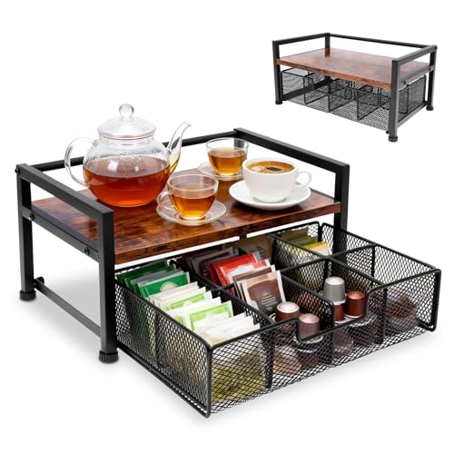 Coffee Bar Organizer for Countertop, 2-Tier Coffee Station Organizer with Metal Frame & Wooden Shelves, Coffee Accessories Organizer Rack for Pods, Syrups, Cups & Tea Bags
