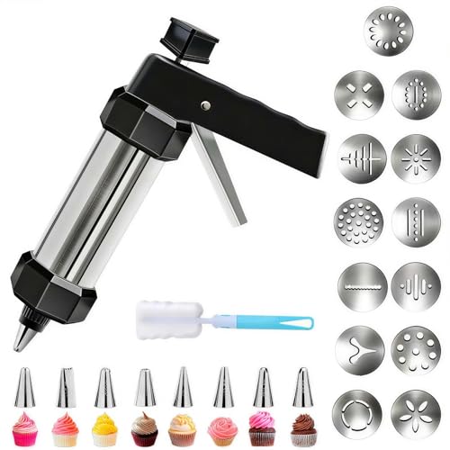Stainless Steel Spritz Cookie Press Set, Cookie Press Gun Kit with 8 Piping Tips and 13 Discs, Cookie Bazooka for DIY Maker and Decorating Baking Supplies