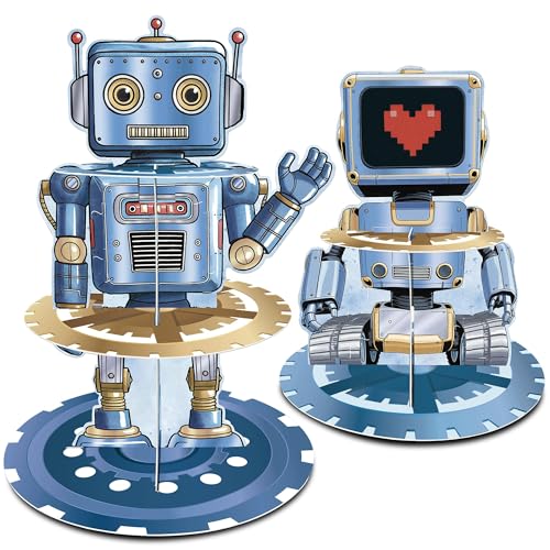 GRULLIN Watercolor Blue Retro Robot Cupcake Stand Set, Metallic Steampunk Robot Dessert Tower Holders Birthday Decorations, Science Tech Baby Shower Supplies