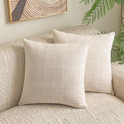 MADIZZ Set of 2 Polyester Linen Throw Pillow Covers with Broad Edge Soft Boho Decorative Pillow Cases for Sofa Bedroom Modern Pillow Shell 18x18 Inch Ivory