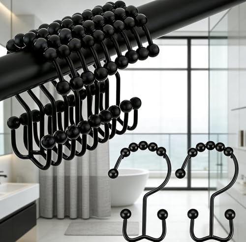 Goowin Shower Curtain Hooks, 12 Pcs Shower Curtain Rings, Stainless Steel Shower Curtain Hangers, Black Shower Curtain Hooks Rings Rust Proof, Minimalist Shower Hooks for Shower Curtain, Black