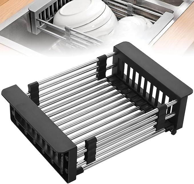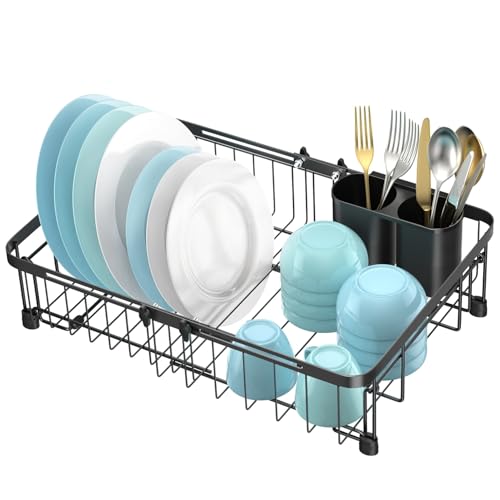 Dish Drying Rack - Extendable Dish Rack, Large Sink Drying Dish Drainer for Kitchen Counter, Stainless Steel Dish Strainer with Utensil Holder (Black)