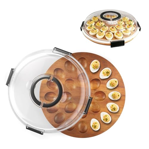 Deviled Egg Tray with lid, 24 Slot Wooden Deviled Egg Platter Carrier Holder Trays with with Handle, Portable Deviled Egg Containers for Party and Home Kitchen, Dishwasher Safe, Brown