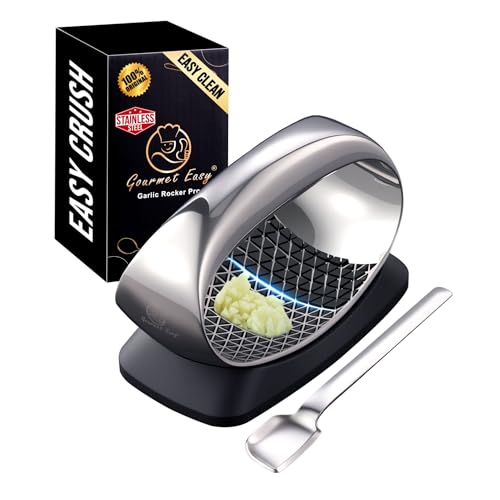 Garlic Press Rocker Stainless Steel with Eject Base + Scraper Spoon, Innovative 3D Cutting, Easy Crush & Clean Garlic Mincer, Premium Garlic Peeler Tool with Non-Slip Ergonomic Grip, 5 Year Warranty