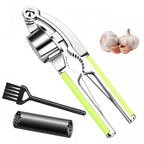 Garlic Mincer, Stainless Steel Garlic Press Rocker Garlic Crusher, New Upgraded Garlic Chopper with Peeler and Cleaning Brush for Smash Garlic Kitchen Gadgets Tools (Green)
