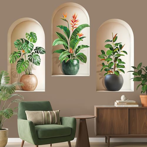 CHDITB 3D Wall Stickers Living Room,3D Wall Art Stickers, Realistic 3D Window View Scenery Wall Sticker, Vase Wall Decal, Plant Wall Stickers for Bedrooms Bathroom Kitchen Wall Decor(Set of 3,8鈥漍16鈥)