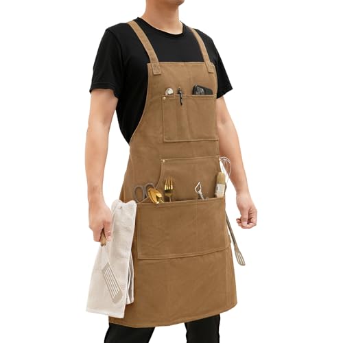 Fammio Canvas Apron for Men Wonen, 16oz Heavy Duty Kitchen Apron with Pockets, Cross Back Apron for Cooking Working BBQ