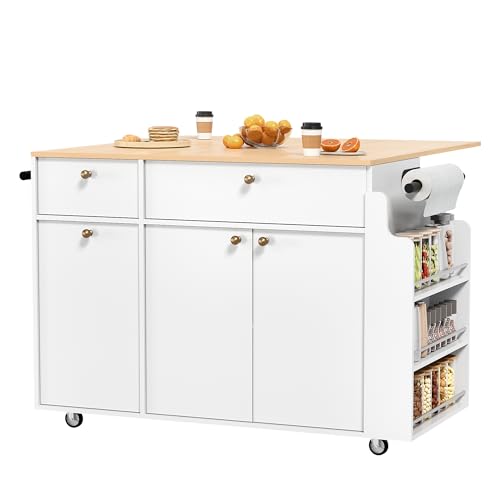 HOOBRO Kitchen Island with Drop Leaf, Rolling Kitchen Island with Hidden Trash Cabinet and Power Outlet, Kitchen Cart with Drawer and Adjustable Shelves, for Dining Room, White and Natural WN50UZD01
