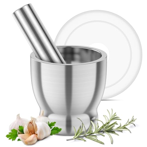AEIMIAIDE 18/8 Stainless Steel Mortar and Pestle with Brush, with Non-Skid Base and Silicone Lid for Grinding Herbs Pills and Kitchen Spices Crusher