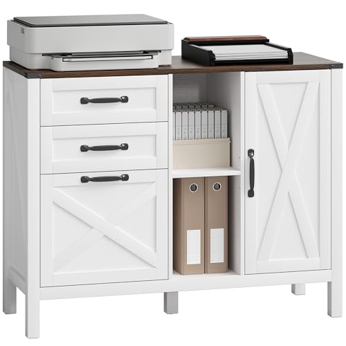 LVB Wood Lateral Filing Cabinet with Drawer, Farmhouse File Cabinet Printer Stand with Storage Shelves, Printer Cabinet Fits A4 Letter Legal Size with Hanging File Folder for Home Office, 32.7" Walnut