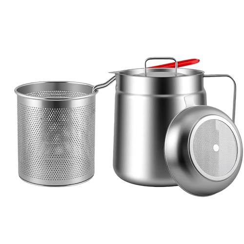 2 in 1 Deep Fryer Pot (2.1L) 304 Deep Fryer Pot with Basket Stainless Steel Frying Pot Oil Strainer Pot with Fine Mesh Filte and Fryer Basket for Frying, Cooking & Bacon Grease Storage
