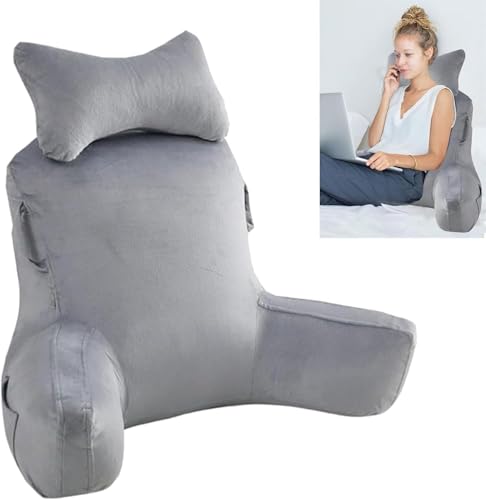 Heymirro Reading Pillow for Sitting in Bed Adult Multi-Function Back Pillow Bed Chair with Arm Rest Big Pockets, Backrest Support Pillows for Gaming/TV/Bedrest/Couch/Floor(Grey)