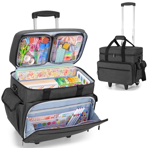 CURMIO Rolling Scrapbook Tote on Wheels, Scrapbook Storage Bag with Detachable Trolley and Bottom Wooden Board, Rolling Craft Bag for Scrapbooking Supplies, Black