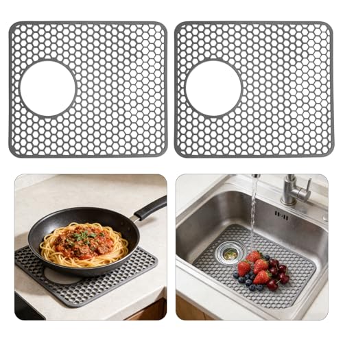 BEHOK 2 Pack Silicone Sink Protector for Kitchen Sink Bathroom Sink 13.58"x 11.6" Sink Mat, Non-Slip and Durable Silicone Sink Grid, Rear Drain (Gray)