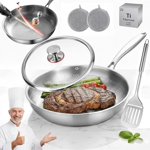 8 Inch Nonstick Frying Pan with Lid, Titanium Ceramic Tri-Ply Stainless Steel Non Stick Skillet W/Lid Small Hybrid Cooking Pan Healthy Induction Egg Frying Pan W/Stay Cool Handle, PFAS/PFOA/PTFE Free