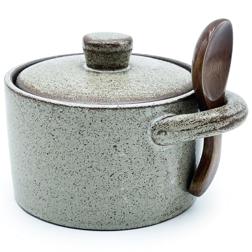 EWEIGEER Ceramic Salt Cellar With Lid & Spoon,8oz Salt Container For Countertop,Sugar Bowl,Spice Jar(Coarse Pottery Color)