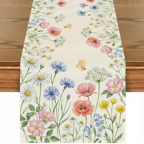Artoid Mode Floral Wildflowers Herb Spring Table Runner, Seasonal Kitchen Dining Table Decoration for Home Party Decor 13x90 Inch
