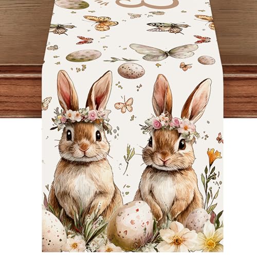 Artoid Mode Bunny Rabbits Eggs He is Risen Easter Table Runner, Seasonal Spring Kitchen Dining Table Decoration for Home Party Decor 13x72 Inch