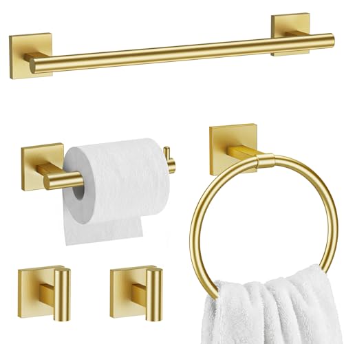 Brushed Gold Bathroom Hardware Accessories Set 5 Pieces Towel Bar Set Round Towel Holder Set for Bathroom Upgraded Toilet Paper Holder with Shelf,Stainless Steel Wall Mounted 23.6 Inch