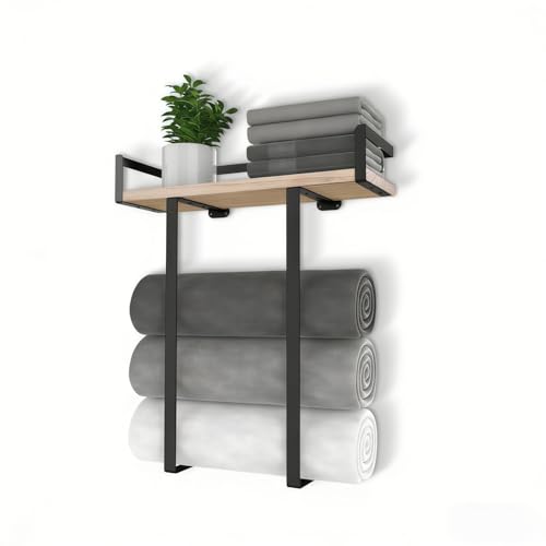 PENGARO Towel Racks for Bathroom Wall Mounted, Towel Holder Wall Mounted with Wooden Floating Shelf & 3 Metal Hooks, Rolled Towel and Hand Towel Rack for Bathroom, Black