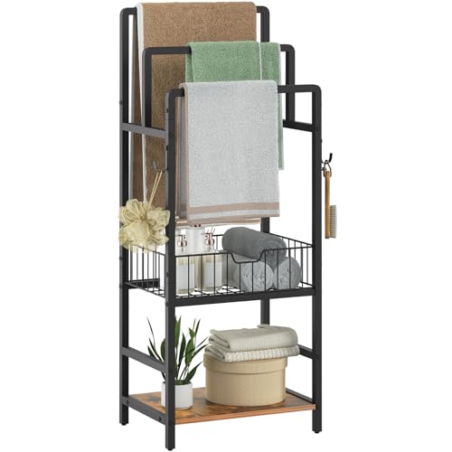 HOOBRO Free Standing Towel Rack, Blanket Rack with 3 Towel Bars, Storage Basket and Shelf, Towel Holder with Hook, Blanket Organizer, for Bathroom and Laundry, Black and Rustic Brown BF13LB01