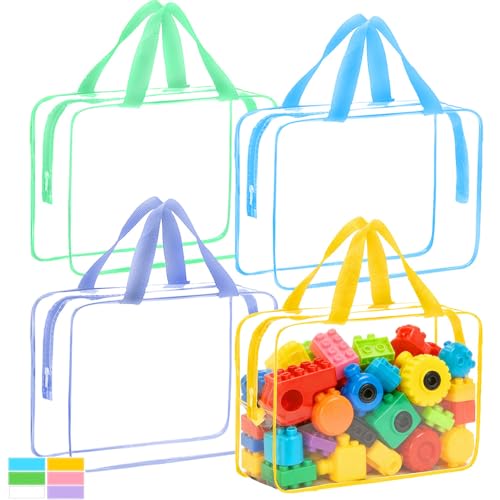 4-Pack PVC Toy Bags, Large 13.8" x 3.2" x 10" Clear Double Zipper Pouches with Handle, Colored Blocks Waterproof PVC Bag for Toys,Playroom,Handmade Accessories (Rigid)