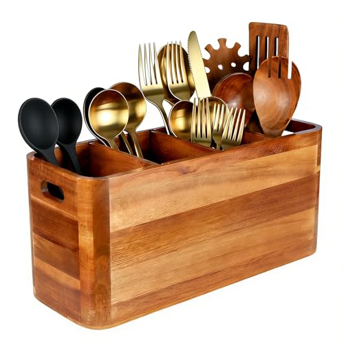 Dokpav Stainless Steel Kitchen Utensil Holder, 4 Compartments Cutlery Organizer with Removable Drip Tray, 18x8.6x13cm Square Flatware Cooking Tools Storage for Kitchen Countertop