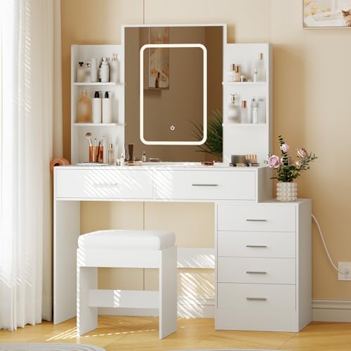 BRIAN & DANY Vanity Stool, Faux Fur Vanity Stool Chair with Storage, Round Makeup Chair Soft Padded Seat with Legs for Bedroom (White)